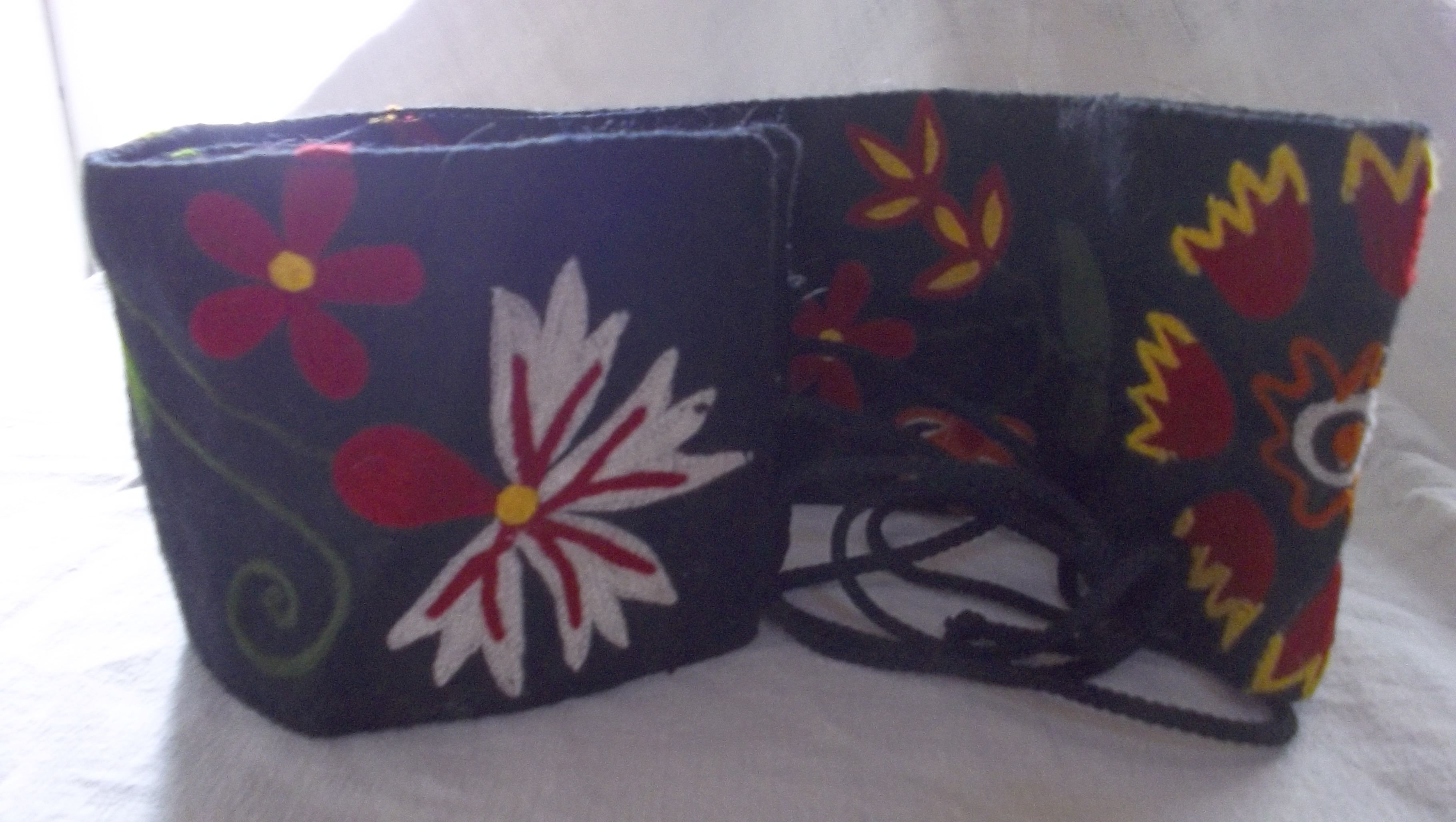 En feutrine noire rebrodée de fleurs, s'adapte à la taille par une cordelette,